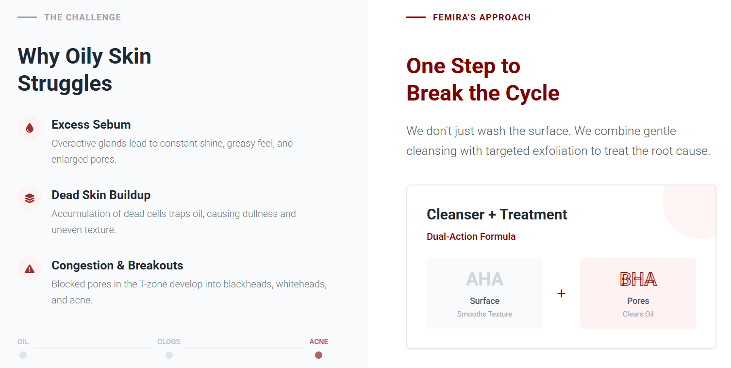 Femira combines gentle cleansing + targeted exfoliation to address the root cause of oily skin.
