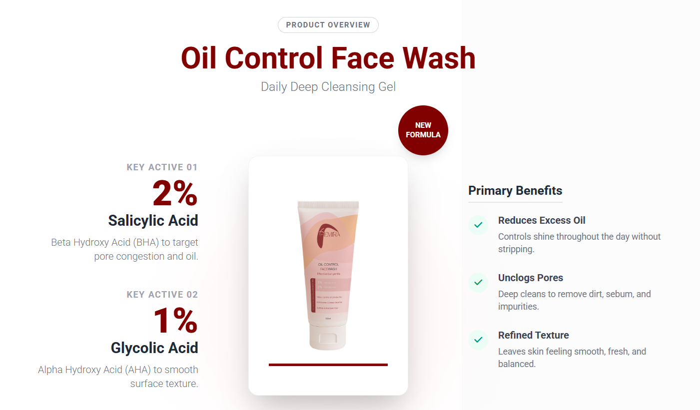 Femira Oil Control Facewash is a powerful yet gentle daily cleanser specially formulated for oily, acne-prone, and congested skin. Powered by 2% Salicylic Acid (BHA) and 1% Glycolic Acid (AHA), it targets excess oil, clogged pores, and uneven texture—without over-drying your skin.